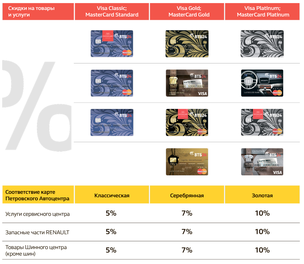 - Карта, випущена банком ВТБ24, дає право на отримання знижок при придбанні додаткового обладнання та аксесуарів в Петровському Автоцентрі, а також при виконанні ремонтних робіт (крім спеціальних комплексних програм в тому числі планового ТО).