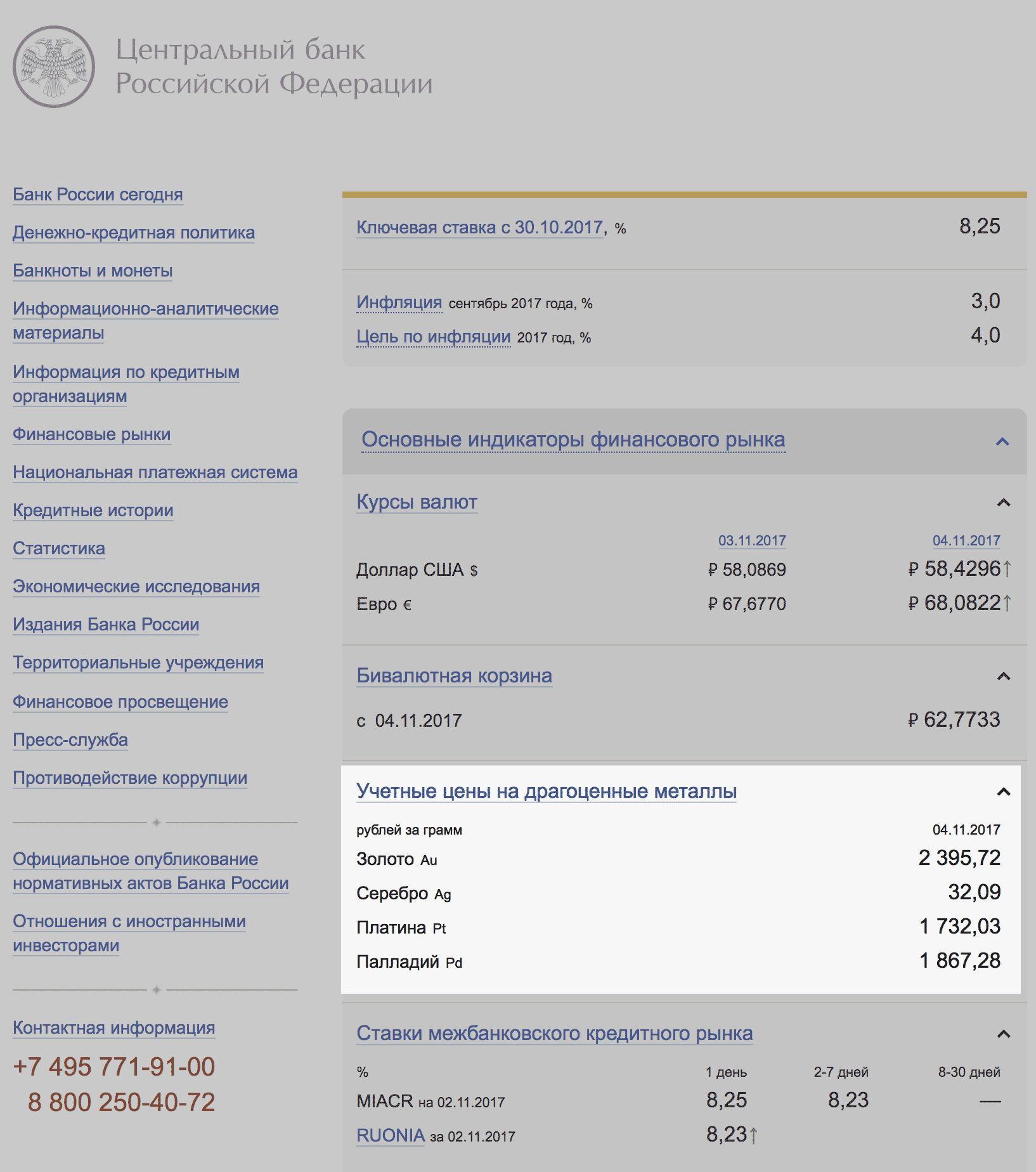 Курс цін на дорогоцінні метали можна подивитися на головній сторінці сайту Центробанку: