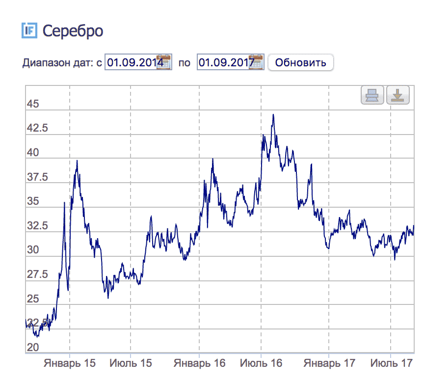 Графік зміни ціни срібла з 1 вересня 2014 по 1 вересня 2017. За даними «Інвестфандс»