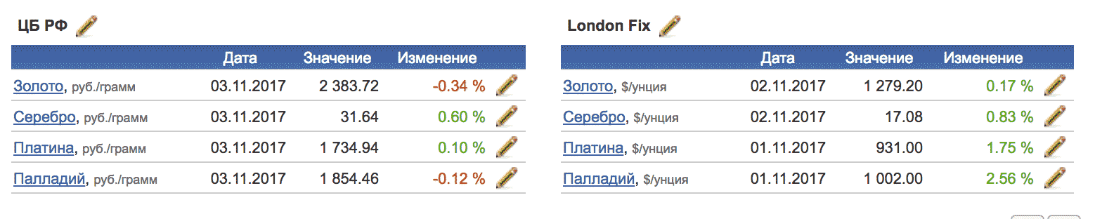 Ціни на дорогоцінні метали ЦБ і Лондонській біржі 3 листопада 2017 року. За даними «Інвестфандс»