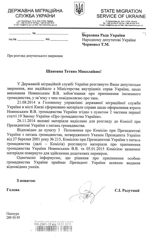 При цьому в адміністрації президента України також відповіли на запит депутата Чорновіл. У документі за підписом глави АП того часу Бориса Ложкіна повідомлялося, що для позбавлення Новинського громадянства України необхідні якісь «додаткові матеріали».