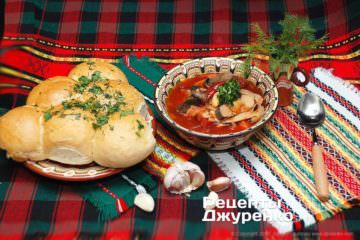 - Дати борщу поваритися ще 10 хв, потім зняти його з вогню і нехай борщ постоїть ще 5-10 хв. пампушки полити заправкою з 1 ст. л. рослинного масла, дрібно нарубаного кропу і часнику. Обов'язково посолити заправку. З огляду на, що і пампушки і борщ з грибами страви пісні, вони будуть відмінно гармоніювати один з одним в пісному меню.