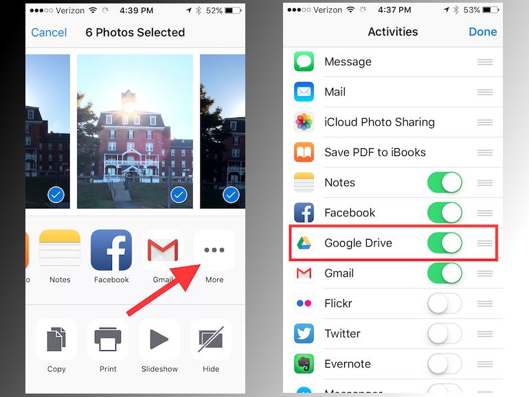 Крок 4. Просуньте вниз і знайдіть варіант: Диск Google. Перемикайте на вимикач. І торкніться значка Google Диск і надішліть їх.