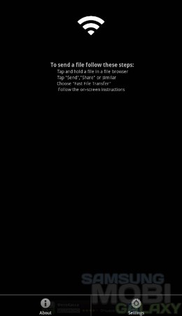 Завдяки програмі Fast File Transfer навіть старі моделі смартфонів, які мають Wi-Fi, можуть з легкістю передавати файли на високій швидкості, для чого буде використовуватися лише модуль бездротової мережі для установки з'єднання, але не інтернет. Особливо цей додаток буде просто золотий знахідкою при передачі великих файлів. Встановлюється програма дуже швидко, власне як і освоюється - досить натиснути на зображення з інструкцією. Примітним є той факт, що для передачі файлів немає необхідності встановлювати це додаток і на прийняте пристрій. Виберіть потрібний до відправки файл, натисніть "Надіслати через ..." і в меню оберіть цю програму.