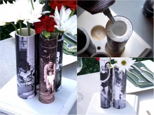 Таку вазу можна зробити на будь-яке свято. Труби ПВХ, закріплені в підставі, фотографії приємних моментів або улюблених людей і, звичайно, квіти.