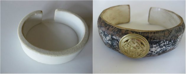 Дивлячись на цей браслет, ніколи не здогадаєшся, що в його основі кільце з труби ПВХ. Трохи фантазії, візерунки-штампи чорним чорнилом, крем для взуття і красива кнопка. тут Детальніше.