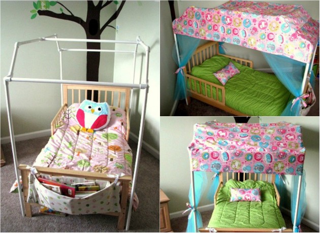 Цей простий навіс з труб ПВХ зможе зробити кожен. Виходить дитяче ліжко з пологом з тюлю.