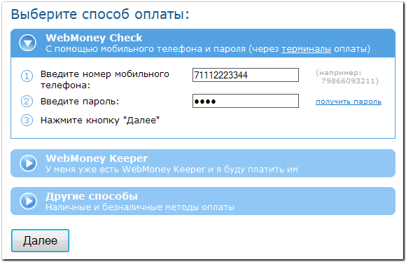 - Перейдіть по посиланню, надісланої в листі нашим магазином. Перевірте суму, список товарів і натисніть на кнопку "Оплатити". Ви будете переадресовані на сайт Webmoney для здійснення оплати. Введіть ваш телефон, пароль (з SMS-повідомлення) та натисніть "далі".