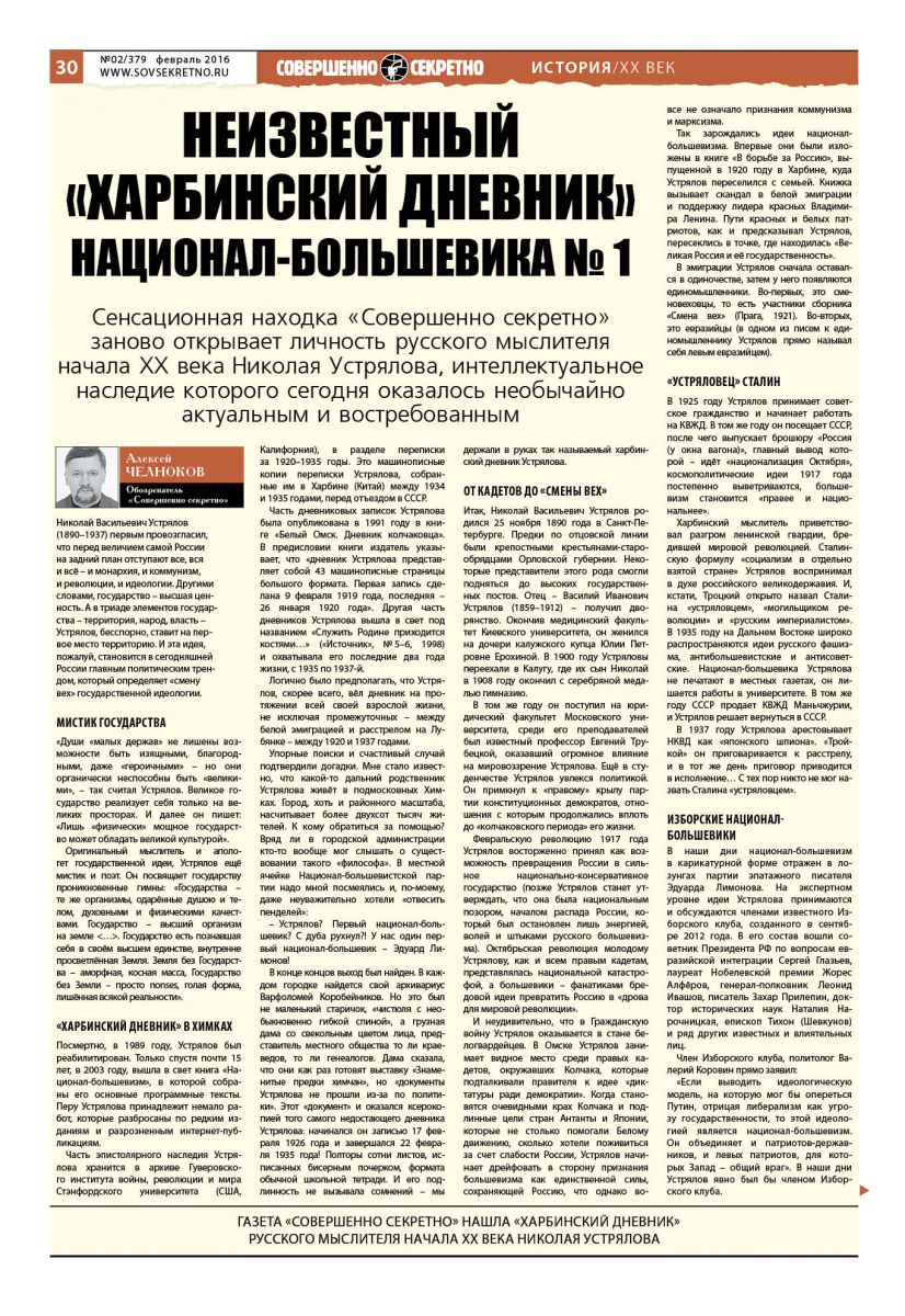 Сенсаційна знахідка «Совершенно секретно» заново відкриває особистість російського мислителя початку XX століття Миколи Устрялова, інтелектуальна спадщина якого сьогодні виявилося надзвичайно актуальним і затребуваним