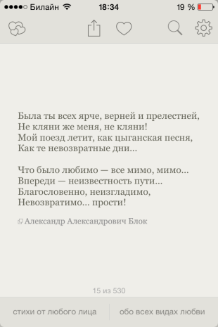 Улюблені вірші можна позначити як вибраний, в подальшому, всі вони будуть відображатися в окремій вкладці. При бажанні, можна збільшити розмір шрифту або відправити текст вірша своїй другій половинці.