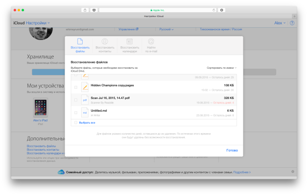 Праворуч від віддалених файлів показується час, що залишився до їх остаточного видалення. По закінченні цього терміну відновити файли буде неможливо. З якого пристрою були видалені файли, не важливо - всі вони будуть перебувати тут. Що стосується календарів і контактів, вони відновлюються зі збережених архівів, які автоматично створюються з певним інтервалом.