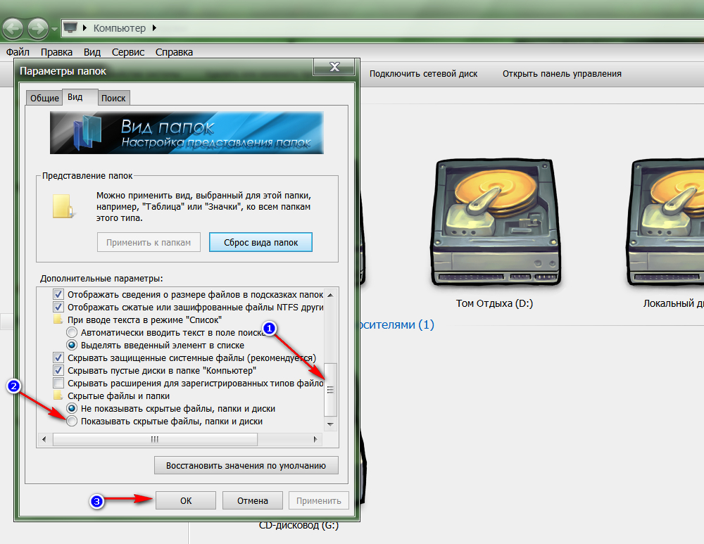 - Потім знову пройдіть по шляху «Сервіс-Параметри папок-Вид» і поставте назад галку на «Не показувати приховані файли, папки і диски», натисніть «Ок».