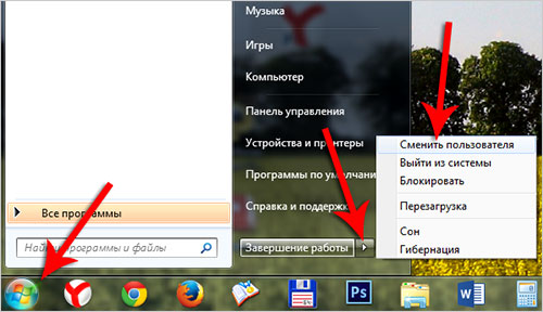 - Увійдіть в меню «Пуск» і, як показано на скріншоті, змініть користувача. Після цього всі ваші папки виявляться на вашому робочому столі.