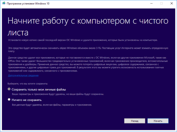 Запустіть файл «RefreshWindowsTool.exe», який був викачаний, прийміть ліцензійну угоду. Після чого відкриється вікно «Почніть роботу з комп'ютером з чистого аркуша».
