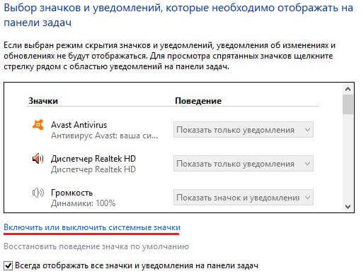 Далі відкриється вікно вибору значків які можна включити або відключити. Натискаємо на пункт «Увімкнути або вимкнути системні значки».