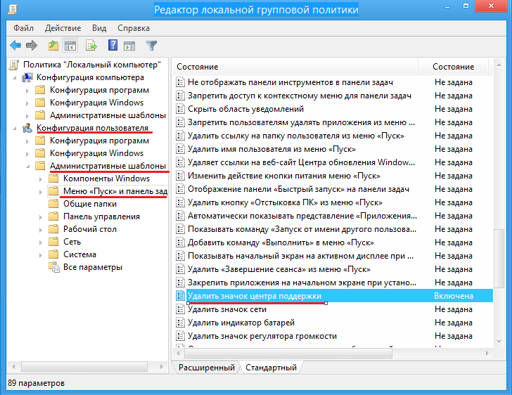 Після цього перед нами висвітиться вікно «Редактор локальної групової політики» в якому потрібно перейти в Конфігурація користувача -> Політики -> Адміністративні шаблони -> Меню "Пуск" і панель завдань -> Видалити значок центру підтримки.