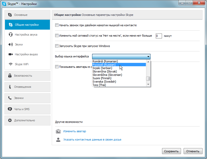 Якщо у вас дійсно відсутня російську мову в налаштуваннях програми, швидше за все у вас встановлена стара версія Скайпу, або у вас встановлений якийсь неофіційний дистрибутив. Тому, потрібно завантажувати і встановити последнею версію Скайпу для Windows . Також, ви можете скачати старі версії , Однак, настійно не рекомендую цього зробити.