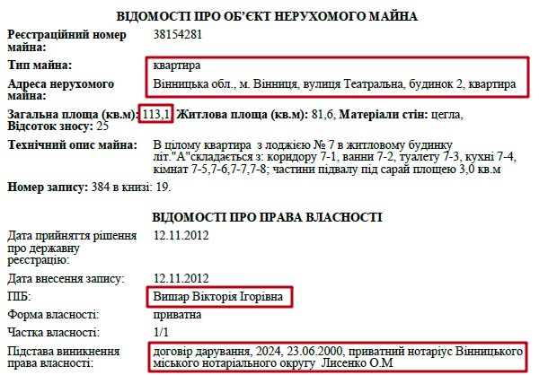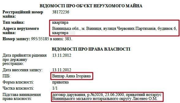 По квартирі також мають і дочки судді. В один день, а саме 23.06.2000 р обидві дочки Вишарі отримали в якості подарунка по квартирі в м Вінниця. Площа приміщення Вишарі Анни Ігорівни нам, на жаль, не відома, так як це не вказано в реєстрі нерухомості. Зате квартира Вишарі Вікторії Ігорівни, розташована за адресою м Вінниця, вулиця Театральна, 2, має площу 113 кв. м.