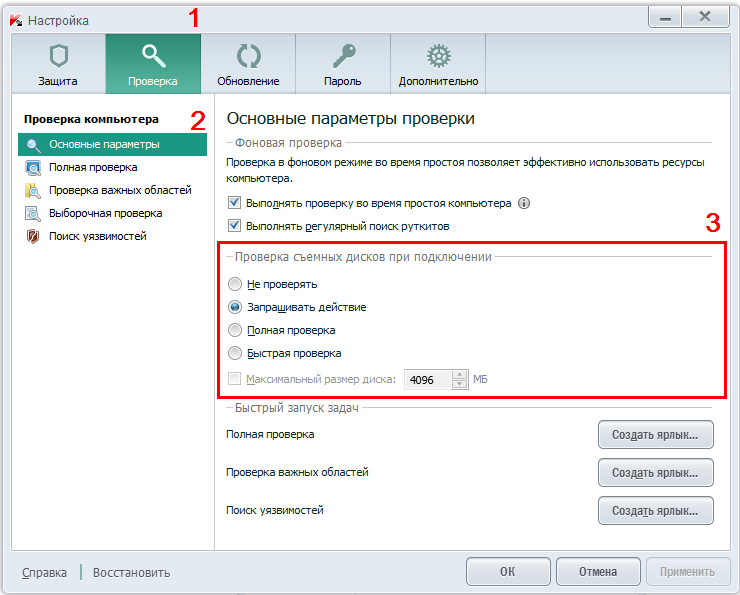 - Запитувати дія - при підключенні знімного диска до вашого комп'ютера буде запитуватися вибір подальшої дії: Швидка перевірка, Повна перевірка або Пропустити.
