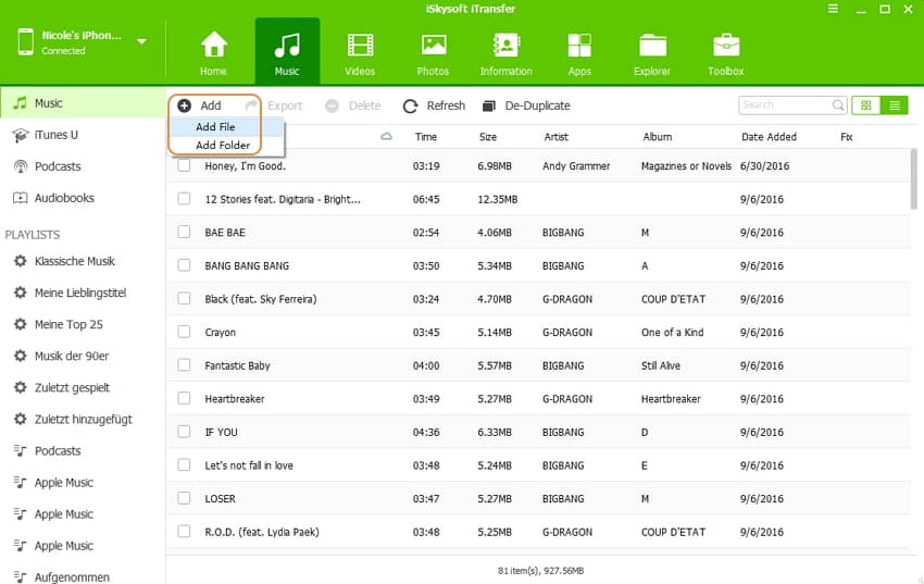1. Якщо ви хочете помістити певні пісні зі свого робочого столу та ноутбука до певного списку відтворення на iPhone, можна натиснути на цей список відтворення, розташований на лівій бічній панелі, а потім скористатися кнопкою " Додати", щоб імпортувати ваші треки. Крім того, ви можете створити новий список відтворення за допомогою контекстного меню і додати до нього пісні.