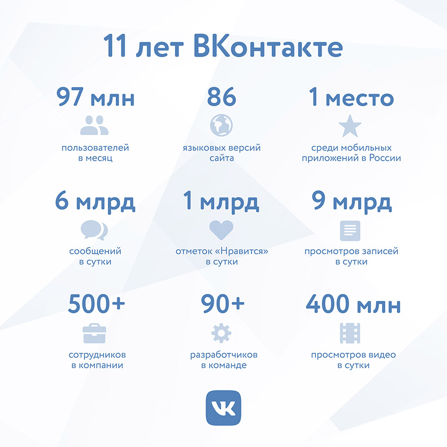 На честь свята спеціально для iz.ru представники «ВКонтакте» підготували інфографіку, яка розповідає про те, скільки повідомлень і відміток «подобається» відправляють користувачі кожен день, скільки людина щомісяця відвідують VK і яка команда працює в соціальній мережі.