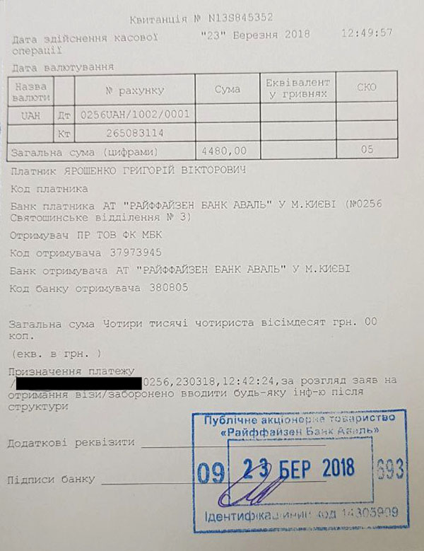На квитанції обов'язково має бути ім'я того, хто звертається за візою