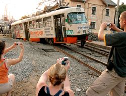 Перехожі знімають зійшов з рейок трамвай