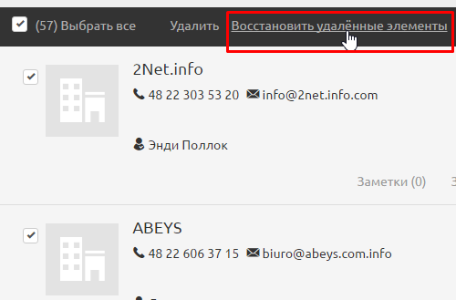 Після видалення контакт (персона або компанія) потрапляє в папку Видалені. Випадково віддалений контакт можна відновити, причому процедура відновлення видалених об'єктів в Livespace однакова для персон, компаній, угод і просторів.