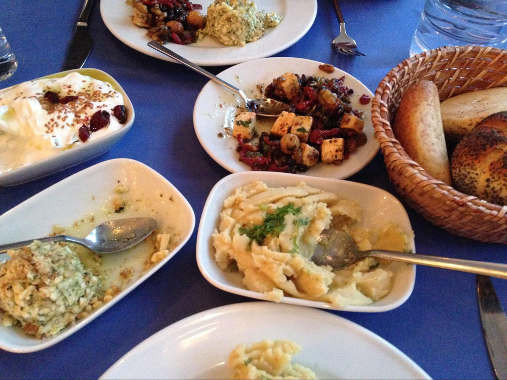 Турецький сніданок в кафе - 50 ₺ з людини. На фото - місцеві сири, овочі, варення, яєчне блюдо Менемен, коржик гезлеме, смажений суджук (вид місцевої ковбаси), сарма (закуска в виноградному листі), місцеві пончики пиши