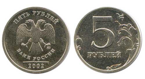 5 рублів 1999 року, а також 1, 2, 5 рублів 2001 року