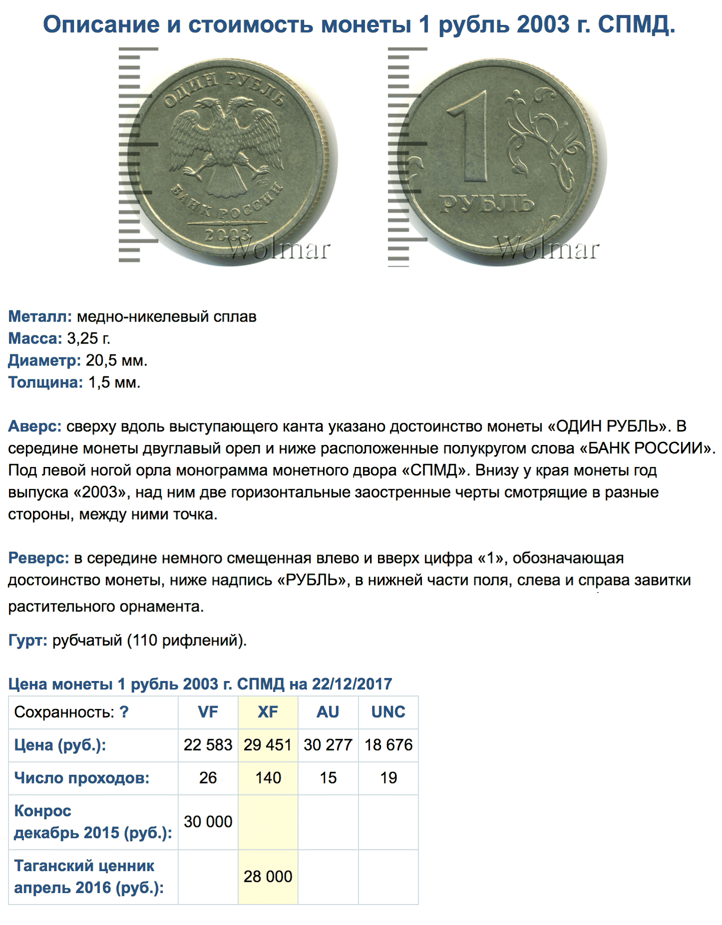Наприклад, 1, 2, 5 рублів 2001 року. Ці монети дуже рідкісні, ціну на них визначає аукціон. Коштувати вони будуть як мінімум десятки тисяч рублів. Ще є 1, 2, 5 рублів 2003 року - вони коштують від 15 до 30 неоподатковуваних мінімумів доходів громадян. Нижче я приведу список, які монети можна продати.
