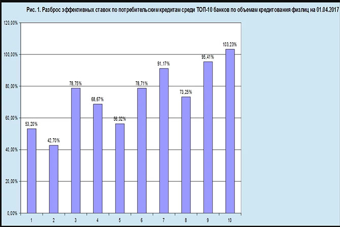 Як випливає з даних моніторингу, ефективна ставка за споживчими кредитами серед ТОП-10 найбільш активних в роздрібному секторі банків коливалася в березні-квітні 2017 року діапазоні від 42,7% до 103,23%. Середній розмір ефективної ставки за активними банкам становив 74,14%.